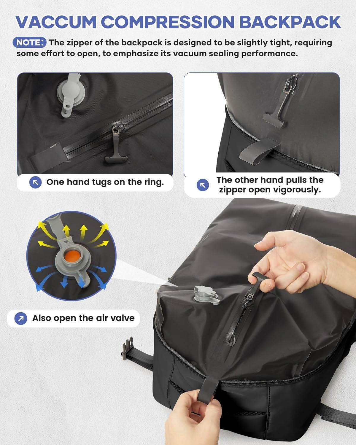Struggling with overpacked bags leaves you frustrated and disorganized during travels. Our vacuum compression backpack transforms your chaotic packing into an organized system. Experience the freedom of fitting twice the clothes while keeping everything perfectly protected and accessible."