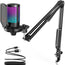 Wait, there’s more! Touch-sensitive mute and a large volume control knob allow for seamless audio adjustments. RGB lighting shows mute status with a vibrant two-tone gradient. Plus, Stability and clarity are boosted by the boom arm, shock mount, and pop filter.